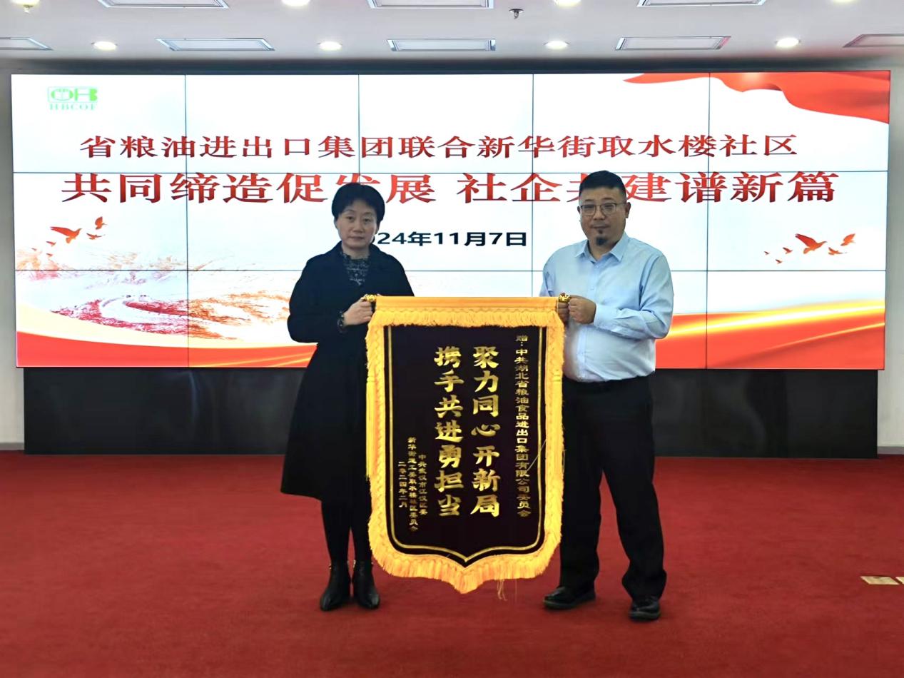 11月7日上午,江漢區新華街道取水樓社區黨委書記、居委會主任趙青一行向省糧油進出口集團送來“聚力同心開新局攜手共進勇擔當”錦旗,以此向集團在長期以來的結對共建活動中所提供的支持與幫助表示誠摯感謝。省糧油進出口集團黨委委員、副總經理張輝代表省糧油進出口集團接受錦旗。