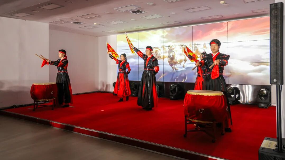 團拜會分為三個篇章,在歡快喜慶的《擂鼓迎春 旗開新程》鼓旗表演聲中拉開序幕。