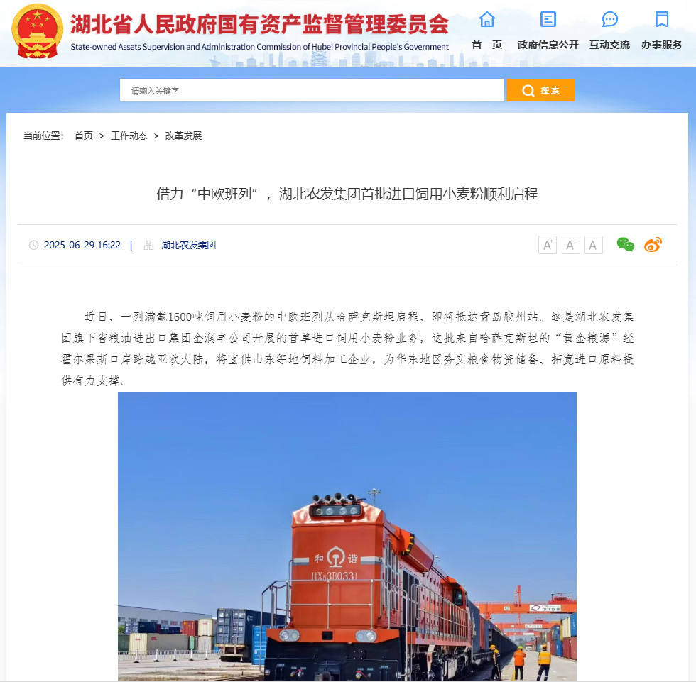 湖北省國資委:借力“中歐班列”,湖北農發集團首批進口飼用小麥粉順利啟程